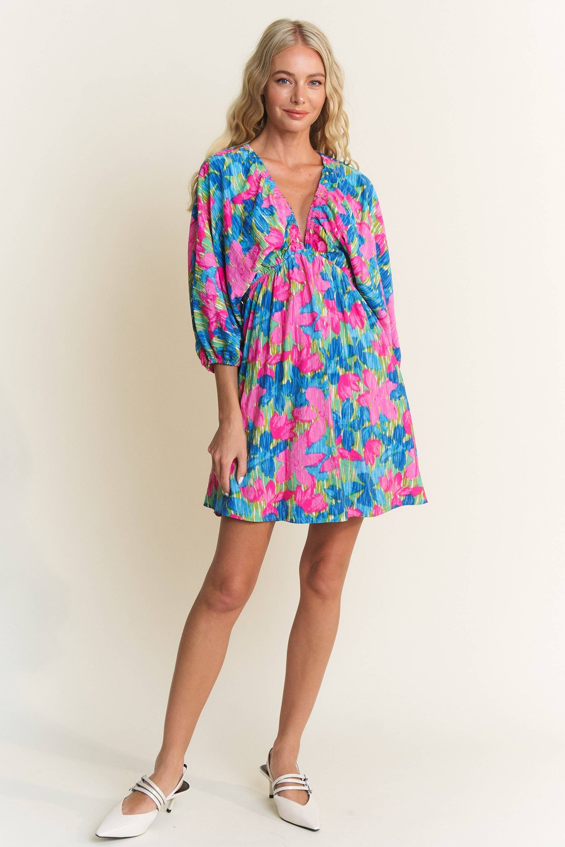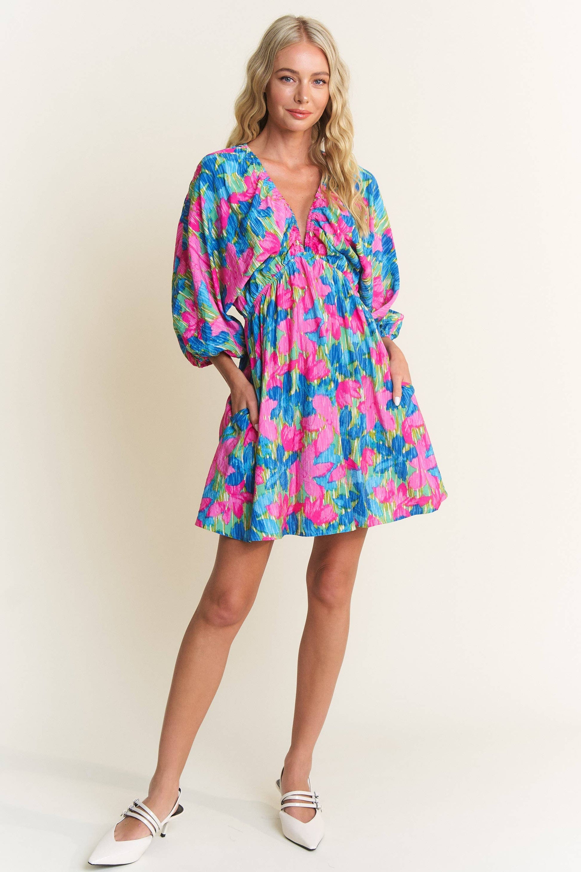 The Blue Blossom Breeze Mini-Dress is your new favorite go-to for effortless charm. Featuring a flattering V-neckline and a playful floral print in beautiful blues, pinks, and pops of color, this dress brings a fresh vibe to any occasion. The airy A-line silhouette flows with ease, while long sleeves with elastic cuffs add a touch of comfort and versatility. Crafted from 100% polyester, it feels light and breezy all day long, and with convenient pockets, it’s both stylish and practical. Step into the season with a dress that’s as fun as it is fabulous!
