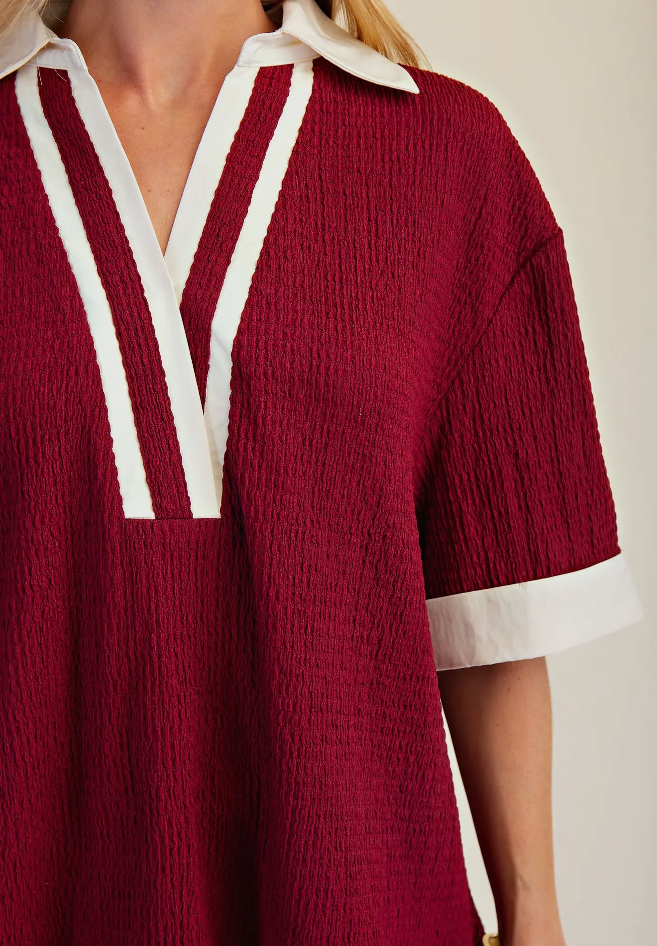 Find fun fashion with the Don't Wine To Me Top. This oversized, collared v-neck top in a rich wine color is perfect for a day out with the ladies or a casual date night. The white details add a touch of sophistication, while the 95% polyester and 5% spandex material ensure comfort all day long. Cheers to looking and feeling great!