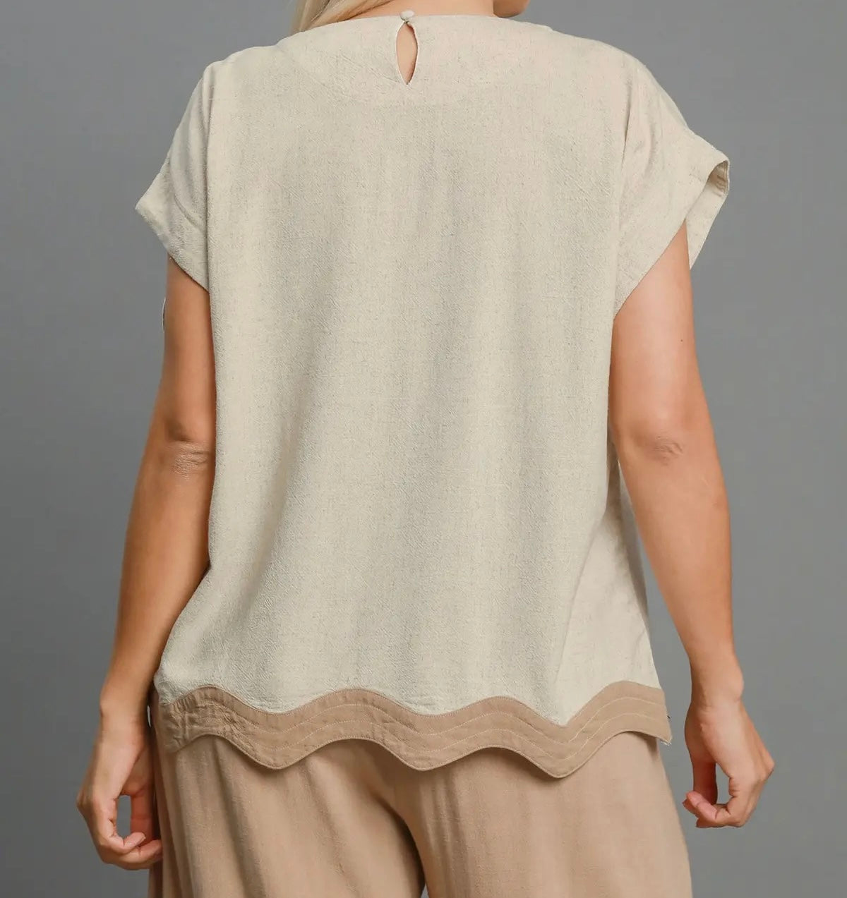 The Luxury Linen Set features an oatmeal color scheme with a short-sleeve top and shorts designed for comfort and style. The elastic waist and adjustable drawstring ensure a tailored fit, while the scalloped edges add a refined touch. Pockets on the shorts enhance functionality, making this set ideal for casual wear.