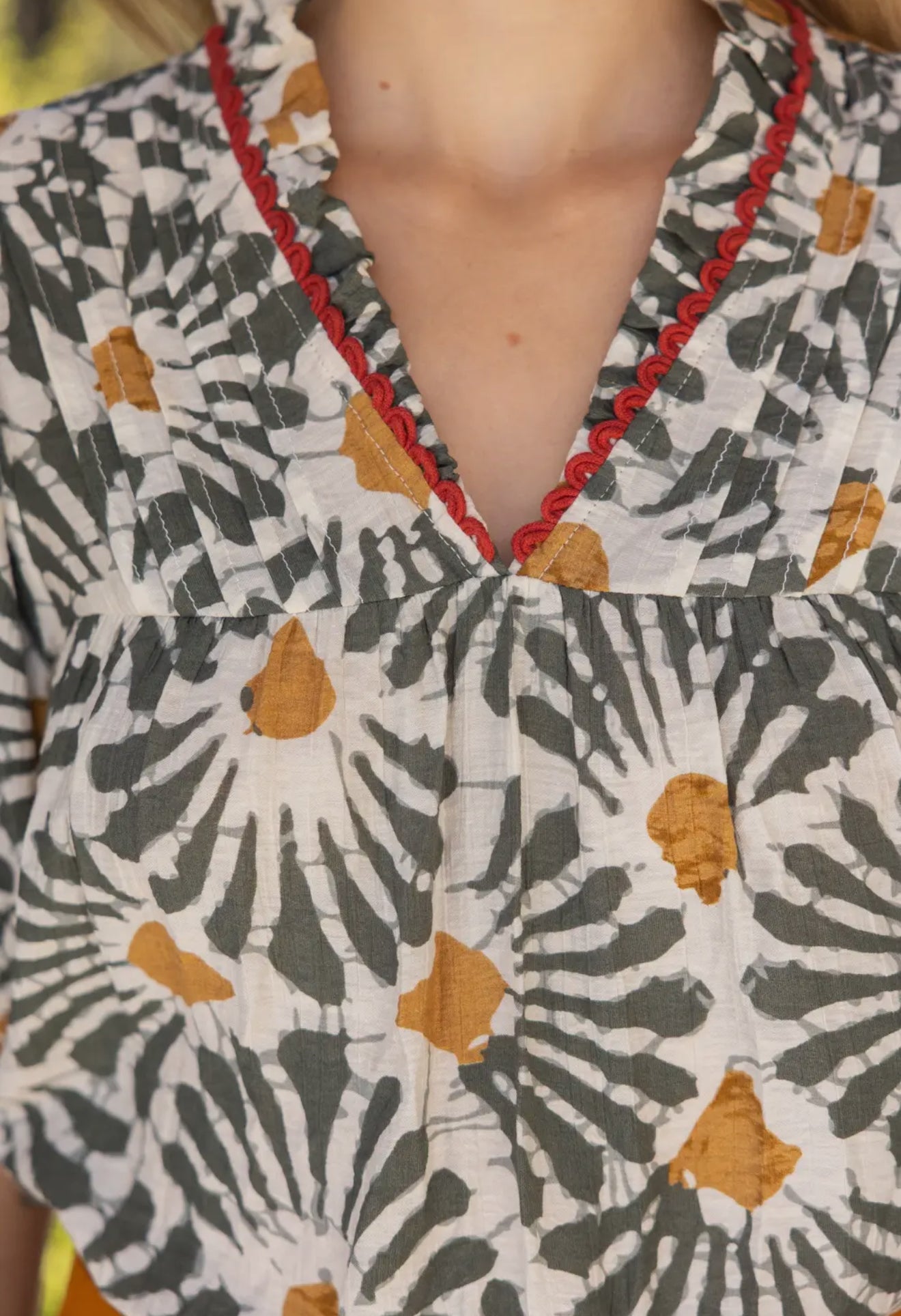 Fall in love with the Rasal Ruffled V-Neck Top. This boho-inspired blouse combines a relaxed fit with puff sleeves and a split neckline. Made of lightweight and breathable floral woven fabric, it's perfect for spring through fall. The wide ruffle and pintuck details add a touch of femininity, making it a versatile favorite for casual chic and bohemian wardrobes.