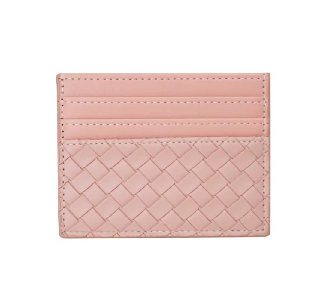 Wally's Woven Wallet is a stylish and functional slam wallet with a vegan leather woven design. Available in pink and blue, it features several slots for cards to keep you organized. Expertly crafted and perfect for any occasion.